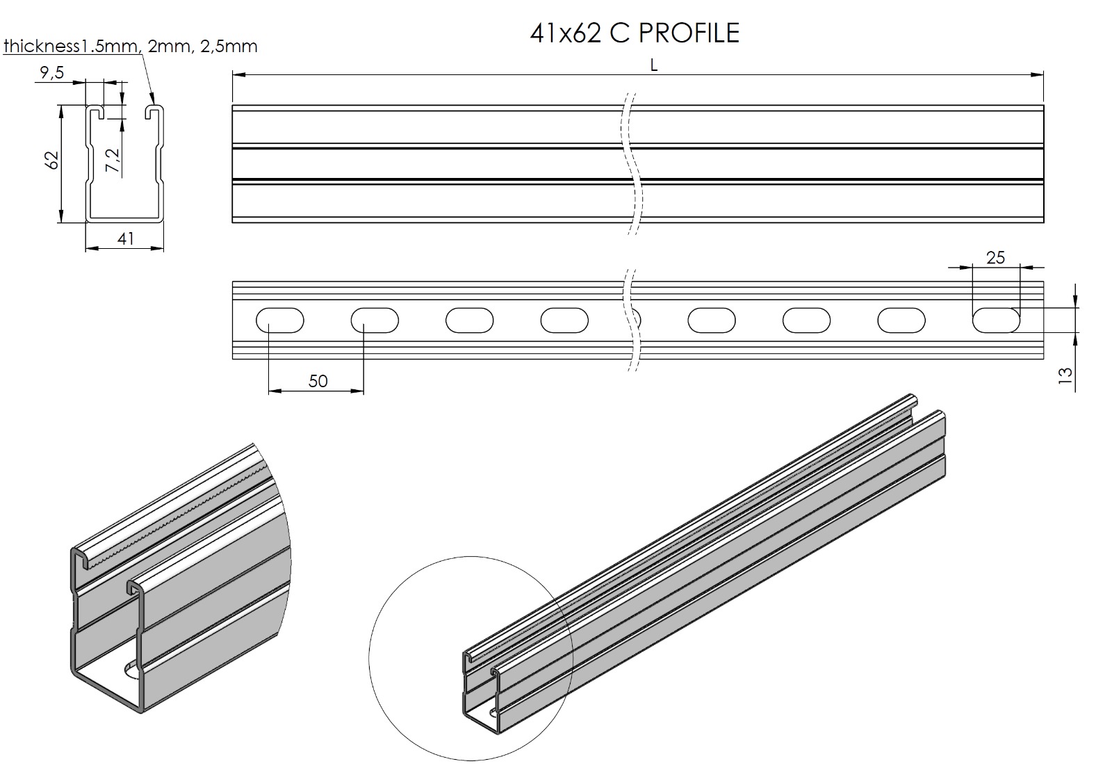 C-profile is made of 2 mm thick steel. Its standard length is 3000 mm but production of different lengths is available. This type of element can be used for attachment to a hanger or a wall, installation of brackets, suspension on studs, as well as cable-support systems for lighting routes.