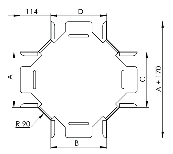 Dörtlü Dönüş, X şeklinde yatay dallanma hatların oluşturulmasına olanak tanır. Genişlik: 150mm, yükseklik: 40mm. Kalınlık: 0,8 mm. Bu ürün, Pre Galvanizli ve Sıcak Daldırma Galvanizli kaplamada mevcuttur.